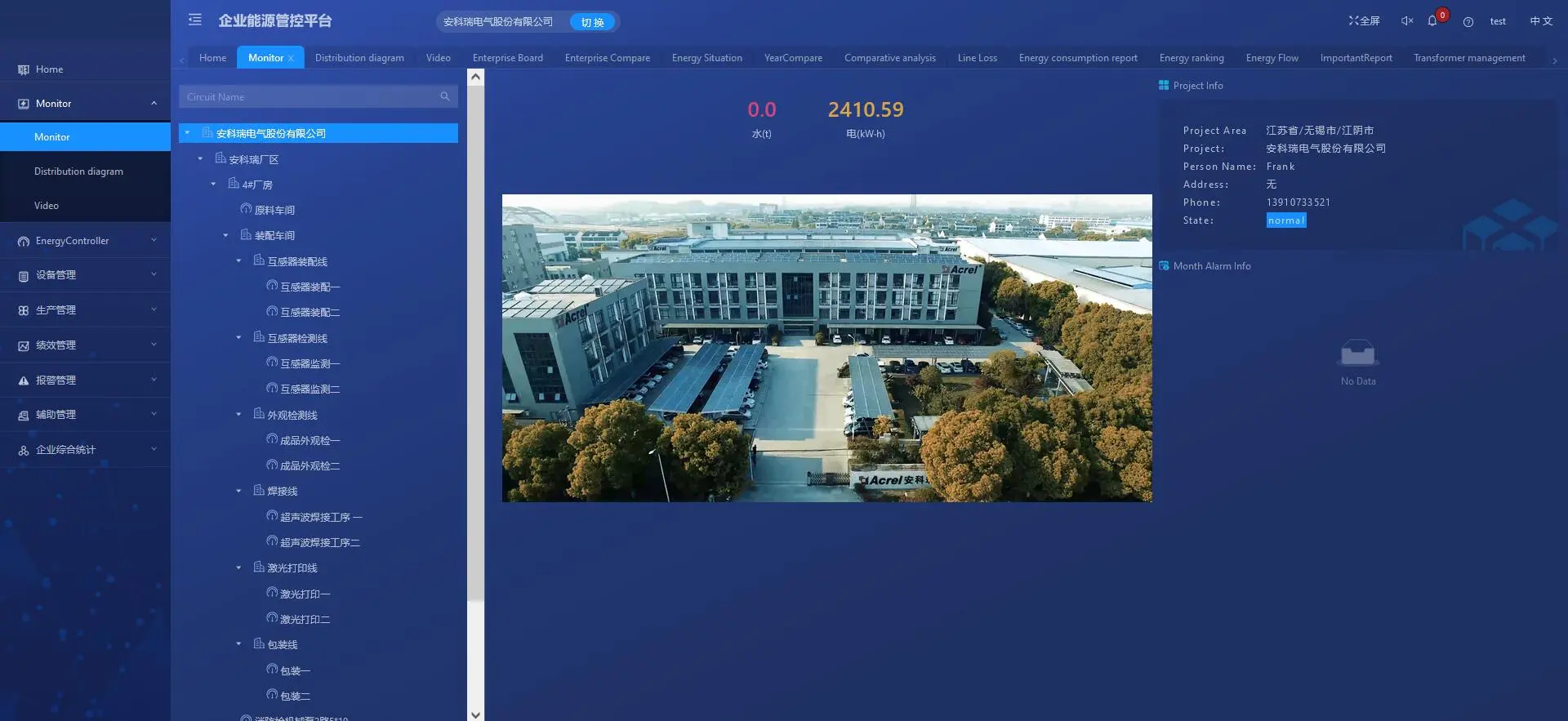 Establish an efficient energy consumption monitoring and management system to conduct real-time monitoring of energy usage and alarms at various points in the factory. So that factory users can monitor the operation of each point in real time, and at the same time grasp the alarms of the points more quickly and efficiently, and provide data support for the factory's technical improvement measures such as peak shaving and valley filling and load adjustment.